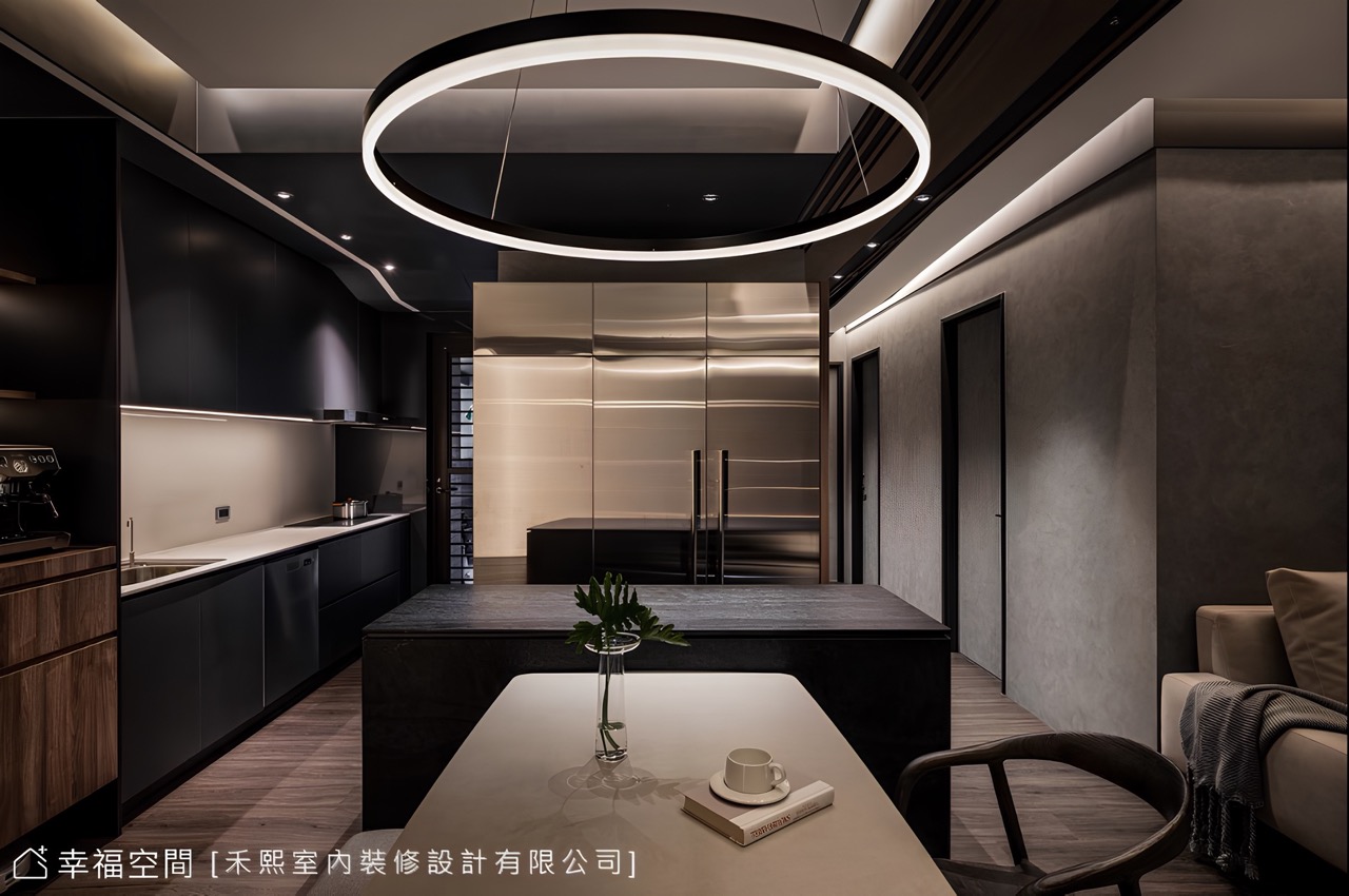 僅僅卸下一牆,卻敞開了無際視野、迎來了開闊心境,依據業主提出的明確需求,未來將在此招待親友,也許聚聚餐、小酌談天或一起下廚,因此設計團隊依循格局配置齊全功能,包含中島櫃、餐桌、紅酒櫃與冰箱,一筆勾勒作業動線,使烹調或聚餐均能流暢順心,男主人也分享:「後來入厝趴找了 20 幾個朋友來小聚慶祝,也完全沒問題!」