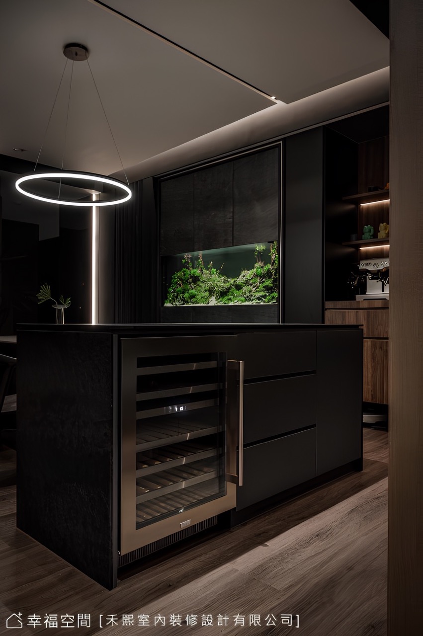 彼此相連的公領域,一道自然生機的水族景觀活絡了生活氣息,男主人親切分享:「小時候有一個夢,便是希望長大後擁有屬於自己的水族箱。」如今在設計團隊的專業協助下終於圓夢!從玄關的穴洞開始蔓延,化成了座有著蓊鬱綠林、潺潺水流以及魚兒漫遊的蓬勃之境,總監表示,在設計之時,日後的維修也必須同步顧慮。