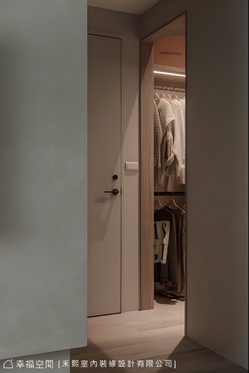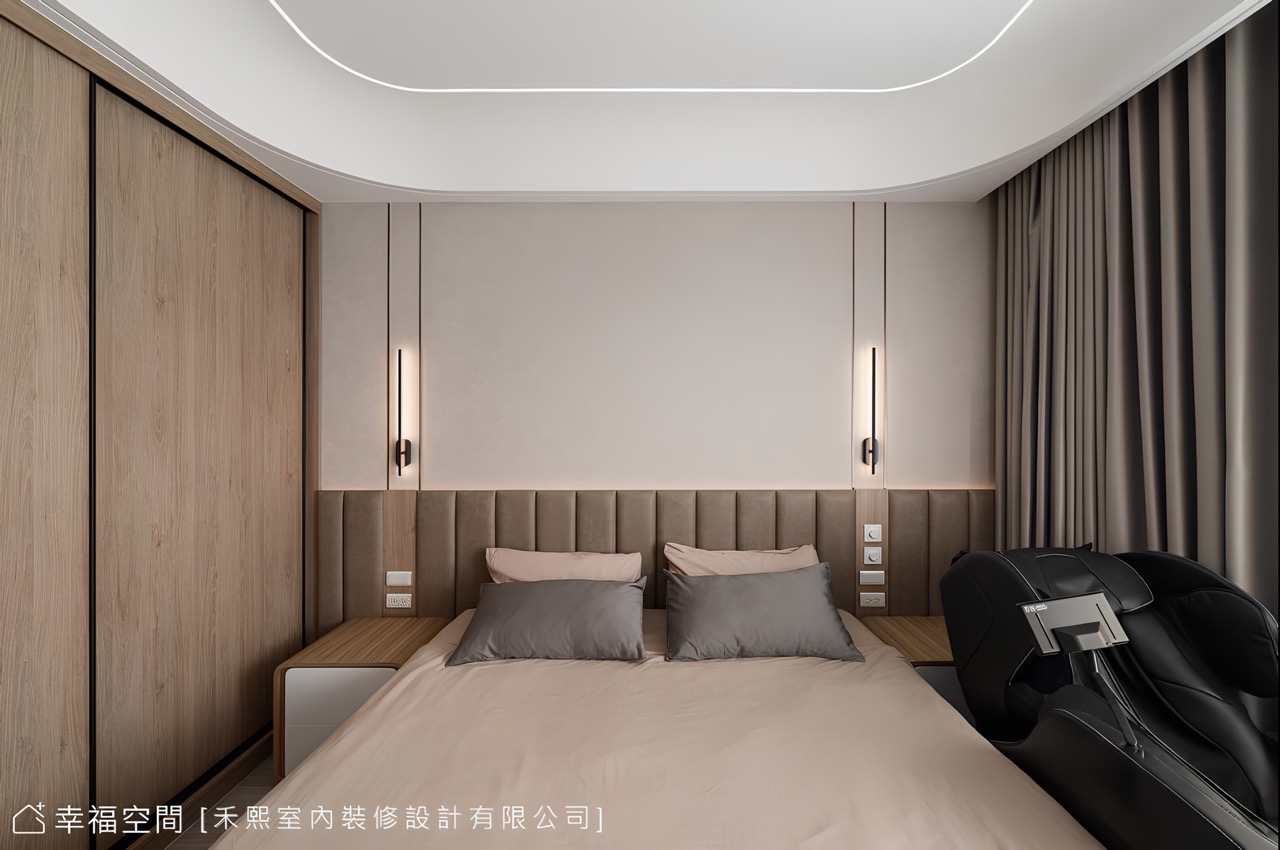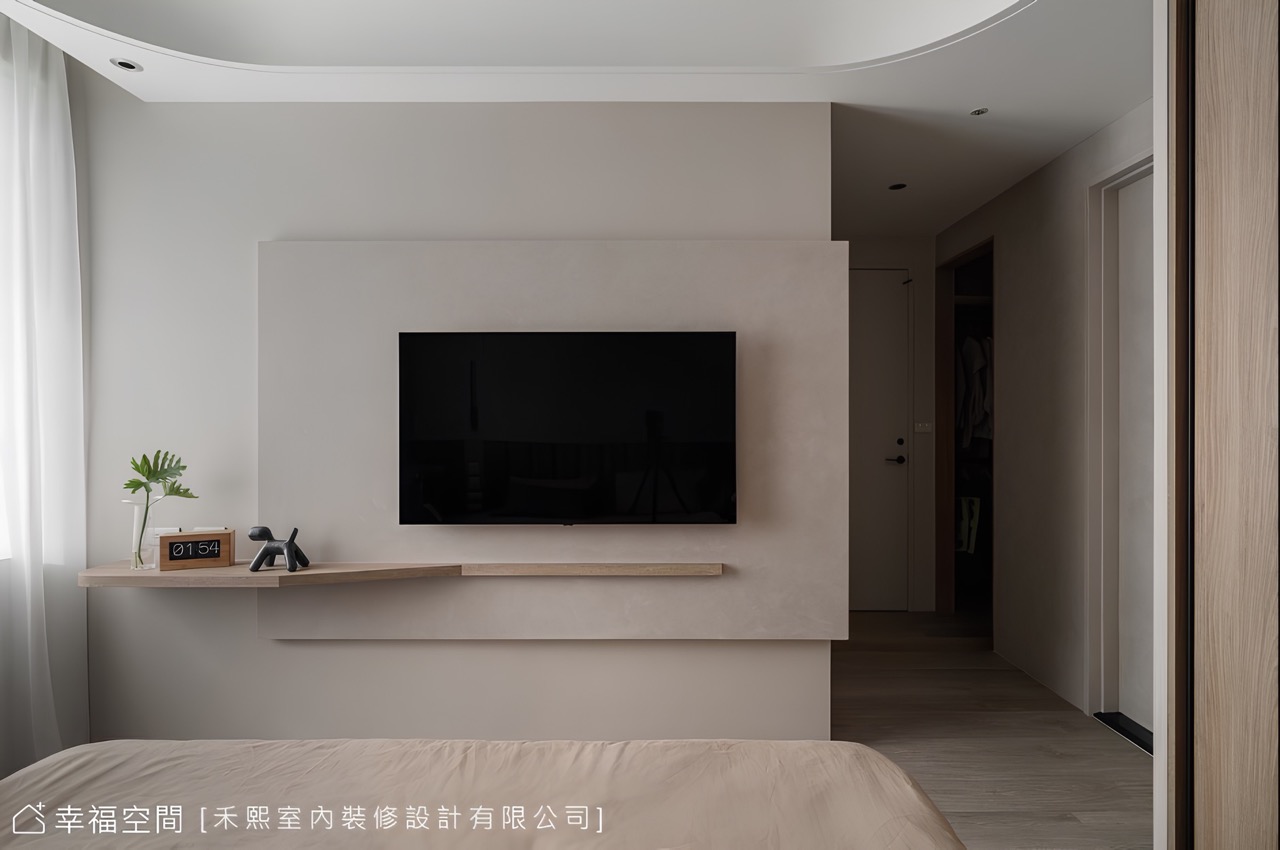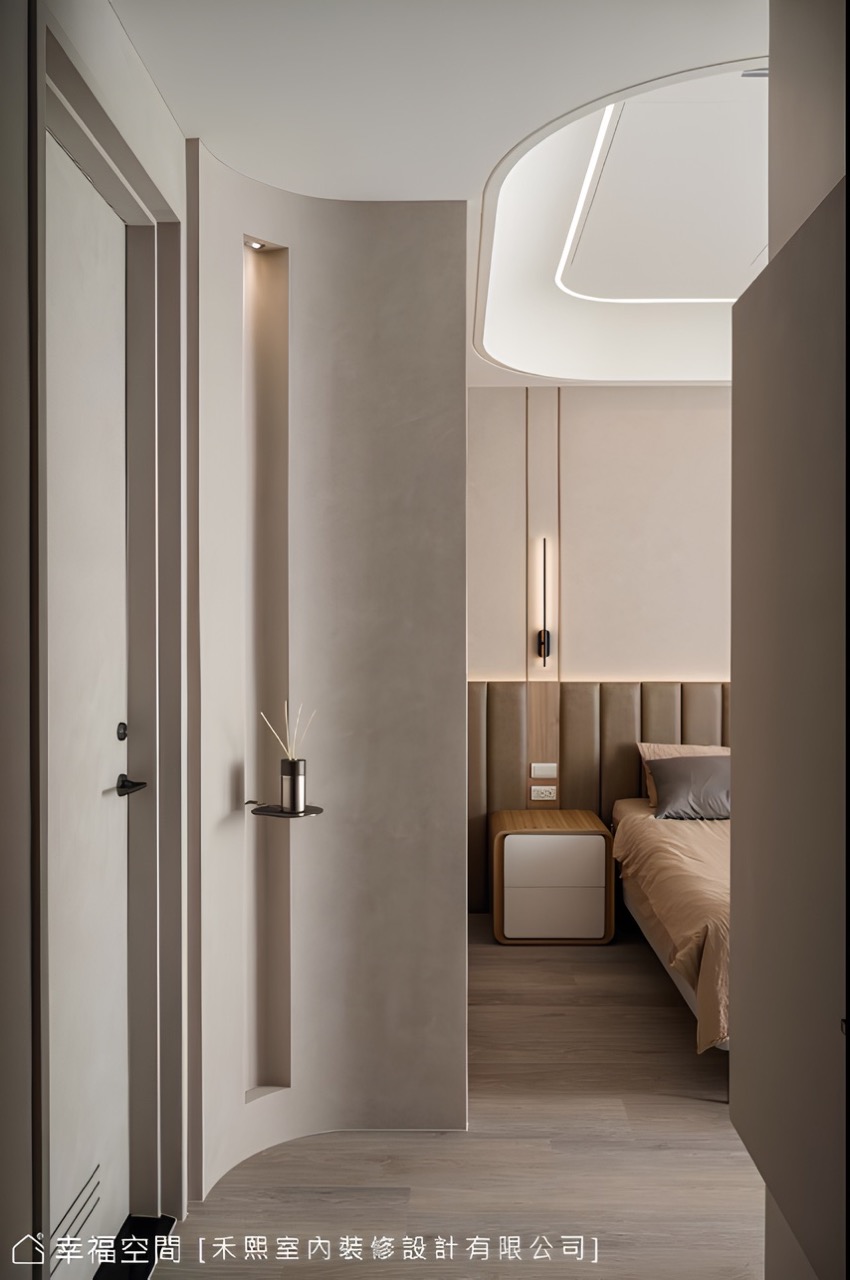 當敞開房門,微光映著鏝抹痕跡揭開私領域序幕,同步引介玄關手法挹注溫柔圓弧,宛若穴洞般牽引著視線循序向前,相似材質卻輕柔了色調,溫和過渡了公私之間,設計團隊在此強調了弧形語彙,消弭銳角的生硬、烘托溫潤休憩氛圍,依序於床背鑲裹繃布泡棉,即可舒適倚靠觀看電視,同時搭載可調色溫的燈光,便能調節亮度提升睡眠品質。