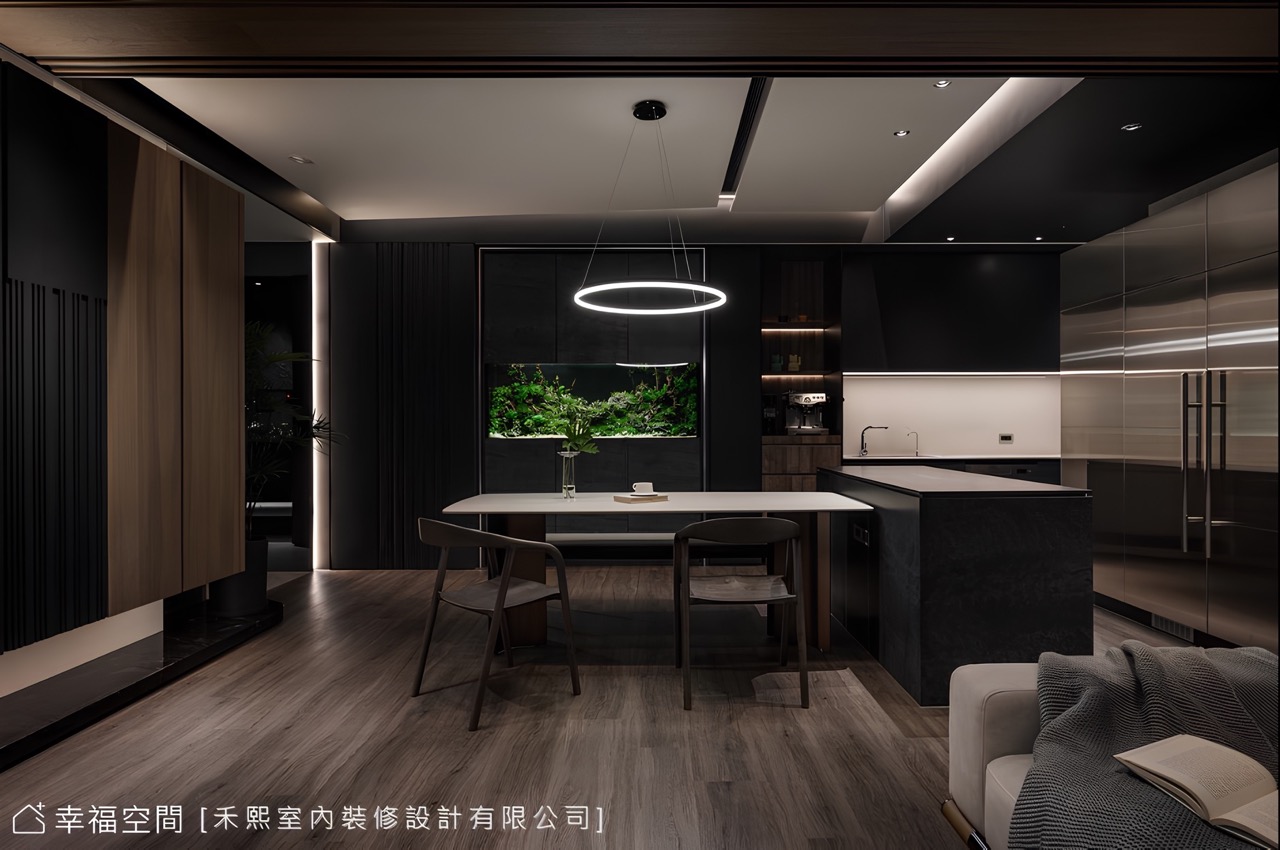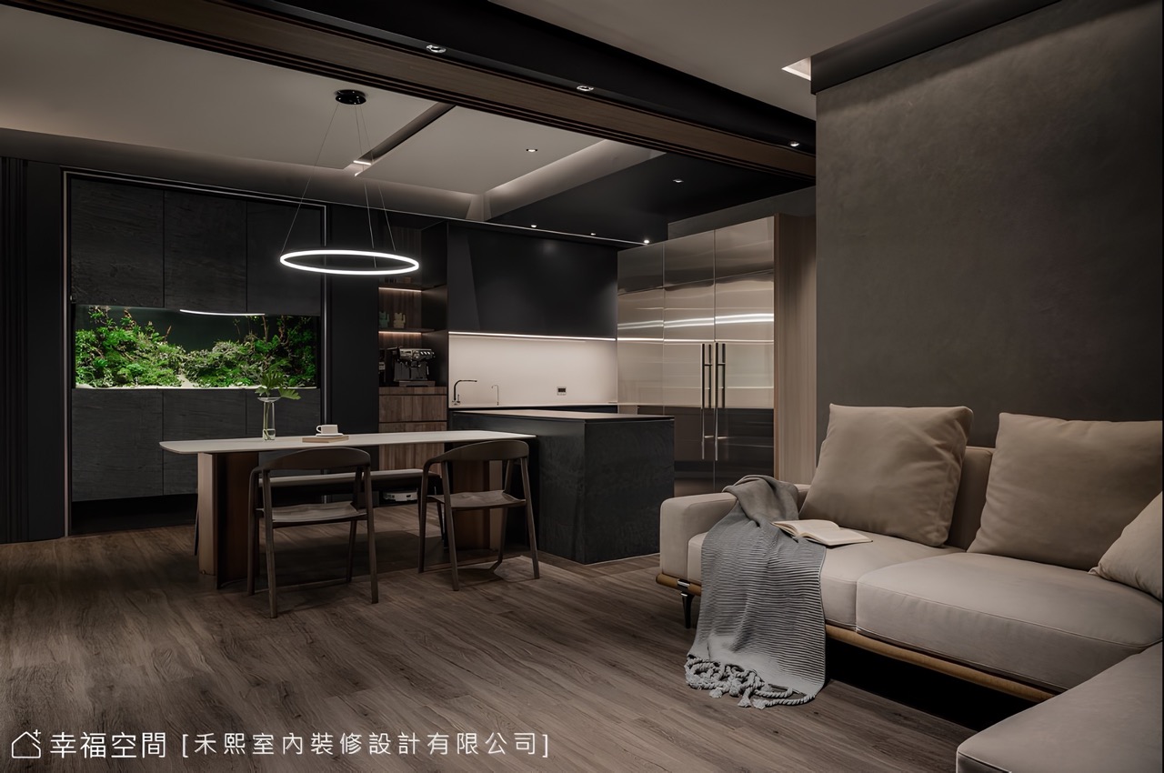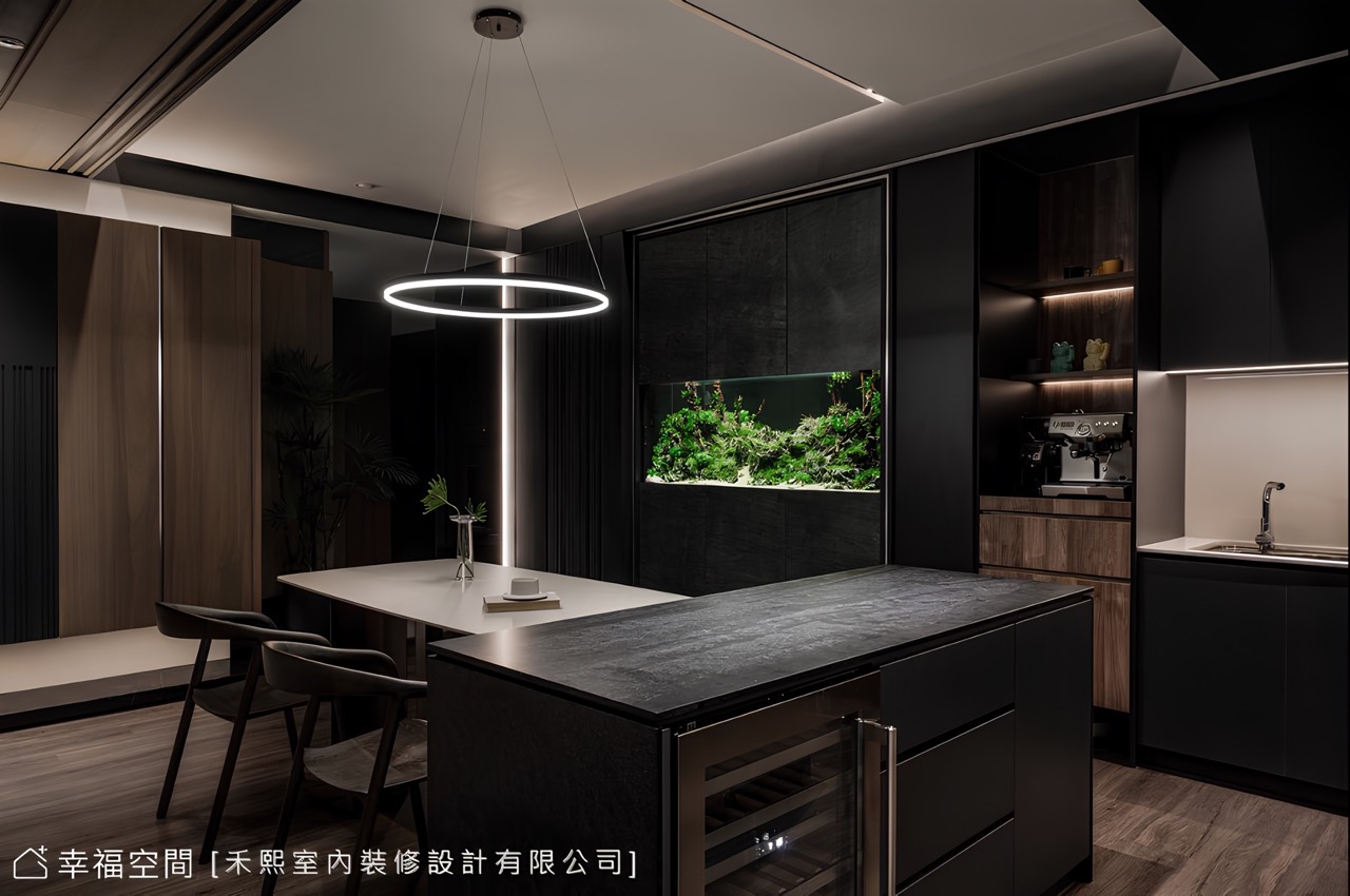 因此針對水族箱設計,以岩板櫃體鑲框魚缸,憑藉可拆式上下櫃與全活動門片,便於後續的保養維護,同時也能將繁瑣的器材設備妥善配置,無須擔心影響景觀。長遠的專業思維不止於此,男主人笑道:「在預算因素下,原本打算不拆牆,維持餐廚既有格局,但在設計師的分析建議後,決定按照原有設計將牆打開,如今證明設計師的堅持是對的!」