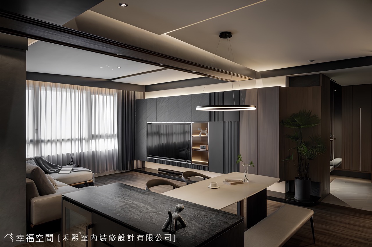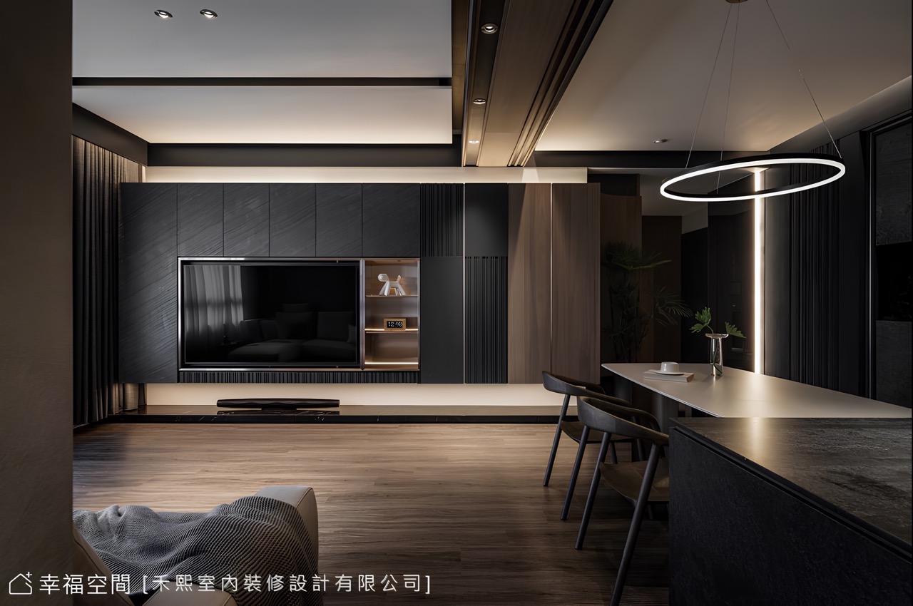 一筆優柔內弧引領人們循序向前,視閾也隨之敞開,開闊無拘的公領域使心境瞬間豁然開朗,而沈穩內斂的場景背後,同步蘊藏著細膩筆法。鑑於客廳具有足夠的跨度條件,因此將收納機能集中一體,憑藉醇厚份量定調主次關係,亦可將生活零碎收整無形,值得一提的是,電視牆暗藏玄機,既能自由調整電視角度,在餐廳也能輕鬆觀賞,亦藏有敞闊儲藏功能,使電視牆機能不再單一。