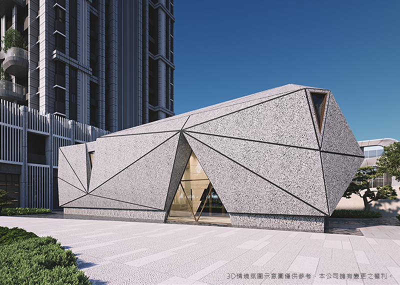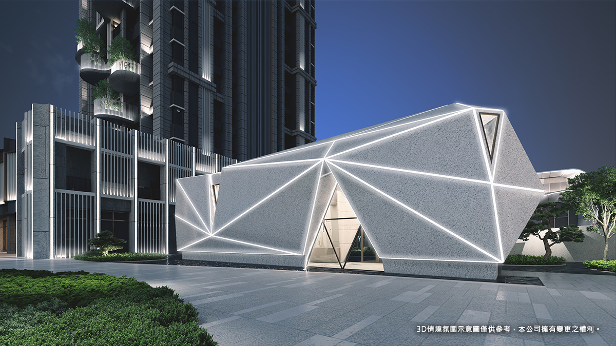 如鑽石璀璨耀眼,如星星純淨永恆。門廳融入象徵永恆的元素,以幾何線條,雕琢如鑽石切面的外觀,俐落的線條,於夜晚透出如恆星的光,打造華麗、雋永、時尚、優雅的禮賓排場。